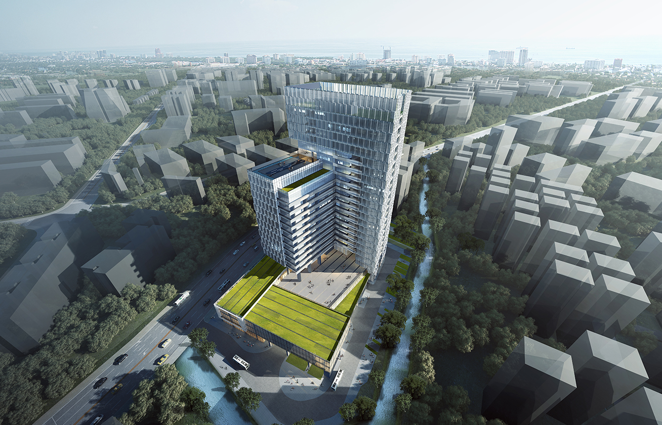 项目整体呈现双T扭转形体,与周边的城市肌理相呼应,形体组合简约大气,现代时尚。“世界之眼”作为建筑造型的符号,表现出落地于当下,展现未来的寓意。立面设计采用现代风格,从时尚时装中提取布艺的编制与裁剪的纹理,以抽象的方式提取并表现于塔楼表皮与裙房,赋予建筑简单时尚的艺术气质,彰显现代感和尊贵感,与大浪整体气质相呼应。
