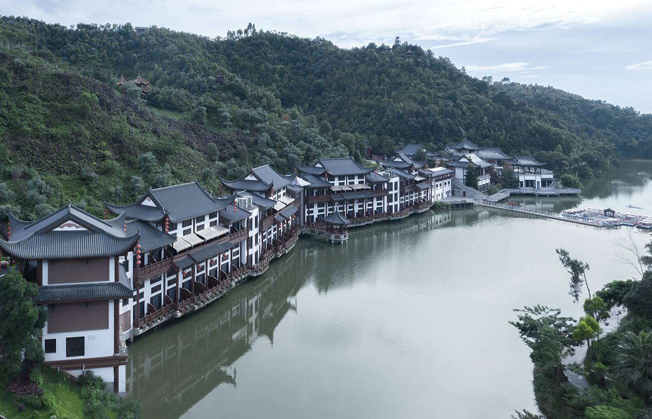 为协调与已建成的游客中心的关系,新建酒店采用纯中式古典建筑风格,设计以素雅纯净的白墙黛瓦为核心特征,通过歇山顶、起翘、连廊、亲水平台等元素,形成具有传统意境的建筑群落。同时,项目在公共空间、风雨连廊的规划上都借鉴了传统造园手法,在直露中有迂回,营造变化有层次的空间。